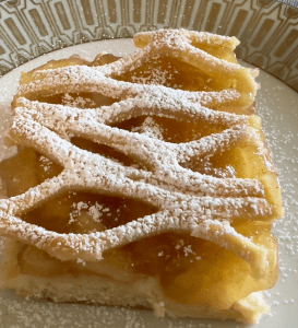 All this goes through my childish mind as I’m devouring this square of apple pastry. I have to admit the powdered sugar helped. Ice Cream would have helped more, but ice cream was something for a different day . I didn’t learn what “a la mode” was until we came to America.